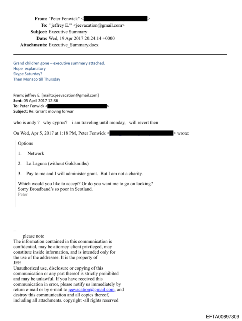 Η Κύπρος εμφανίζεται επίσης ως πιθανή βάση για ακαδημαϊκή ή ερευνητική δραστηριότητα. Σε email τον Ιανουαρίου του 2017, ο Βρετανός ακαδημαϊκός Πίτερ Φένγουικ προτείνει στον Έπσταϊν «να μεταφερθεί η μελέτη στην Κύπρο», χωρίς να προκύπτει αν η πρόταση υλοποιήθηκε.