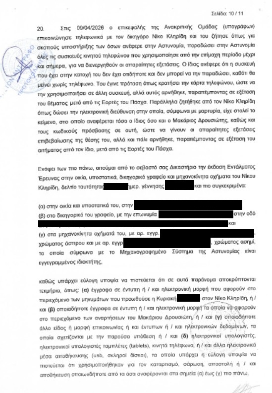 Αρχικά ο ανακριτής αναφέρει ότι ζητήθηκε από τον Νίκο Κληρίδη να παρουσιάσει αυτοβούλως τα εν λόγω στοιχεία (κινητό και κωδικό για e-mail), “εντούτοις ενώ δεν αρνήθηκε να τα παραδώσει παρά ταύτα δεν το πράττει και αντ’ αυτού αναβάλλει την παράδοση τους κατά τρόπο που προκαλεί αβεβαιότητα αν εν τέλει θα τα παραδώσει ή όχι”, γι’ αυτό και ζητήθηκε το ένταλμα έρευνας.