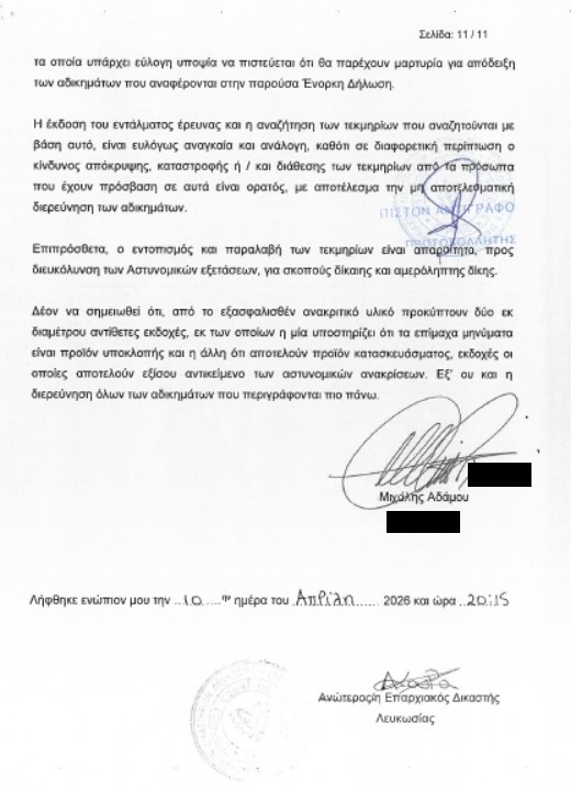 Υπογράμμισε επίσης ότι «το παρόν ένταλμα δεν εξουσιοδοτεί την επέμβαση από πλευράς Αστυνομίας επί δεδομένων προστατευμένων από τα άρθρα 15 και 17 του Συντάγματος. Δηλαδή, που αφορούν την αμοιβαία επαφή μεταξύ ατόμων ή τη μεταβίβαση και ανταλλαγή μηνυμάτων στο πλαίσιο ανταλλαγής απόψεων, αισθημάτων ή ιδεών, ή την επαγγελματική αλληλογραφία ή άλλα δεδομένα επαγγελματικής φύσης, που δεν σχετίζονται με την υπόθεση αυτή.