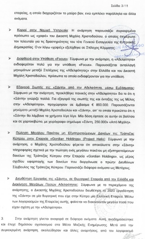 >> Ο πρώην δικαστής Μιχάλης Χριστοδούλου σε δύο καταθέσεις του στην Αστυνομία, παραδέχεται ότι γνωρίζει τη «Σάντη» από το 2020. Την συνάντησε σε τρεις περιπτώσεις (στο γραφείο του, σε πάρκο και σε διαμέρισμα) μετά που εκείνη επικοινώνησε μαζί του μέσω sms.