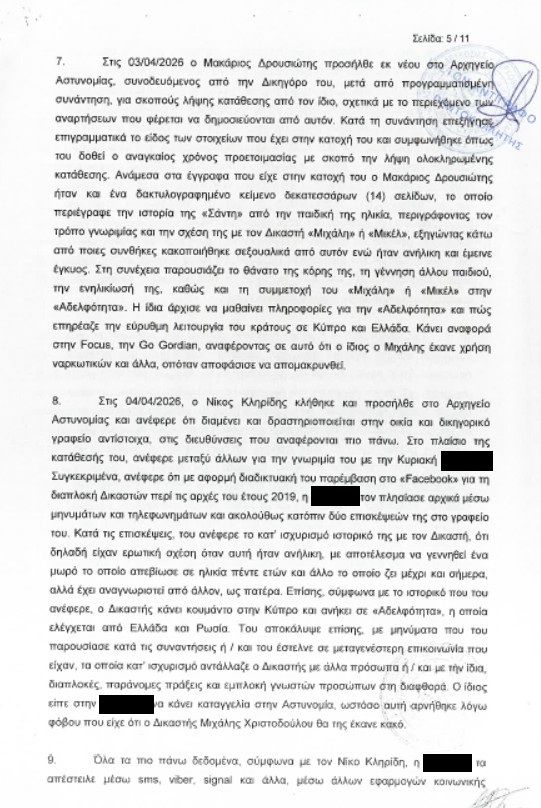 Στη συνέχεια αναφέρεται ότι μετά την πρώτη δημοσίευση του Μακάριου Δρουσιώτη, η Αστυνομία στις 2/4/2026 κάλεσε την «Σάντη» για κατάθεση στην οποία ανέφερε ότι περί το έτος 2022 – 2023 συναντήθηκε με τον Μακάριο Δρουσιώτη, κατόπιν επικοινωνίας του ιδίου μαζί της.