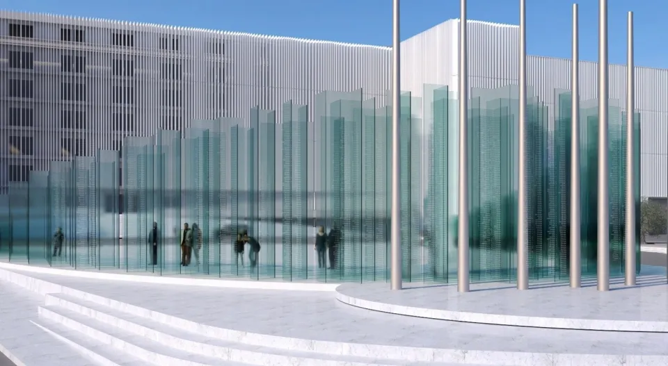Η «Κιβωτός Εθνικής Μνήμης» είναι μία συλλογή από γυάλινες κολόνες που τοποθετούνται σε μία καμπύλη. Ξεκινούν από ύψος ενός περίπου μέτρου και φτάνουν έως και τα έξι μέτρα, ενώ φέρουν πάνω τους χαραγμένα τα ονόματα των 121.692 πεσόντων των Εθνικών Αγώνων της Ελλάδας. Τα ονόματα «αιωρούνται στον χώρο», ενώ και ο βραδινός φωτισμός των γυαλιών τους προσδίδει ιδιαίτερες χρωματικές ανταύγειες.