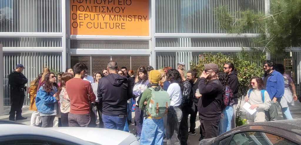 Χωρίς την παρουσία της πολιτικής και διοικητικής ηγεσίας του Υφυπουργείου Πολιτισμού πραγματοποιήθηκε το μεσημέρι της Παρασκευής η εκδήλωση διαμαρτυρίας καλλιτεχνών και εργαζομένων στον πολιτισμό έξω από το κτήριο του υφυπουργείου στον Στρόβολο.