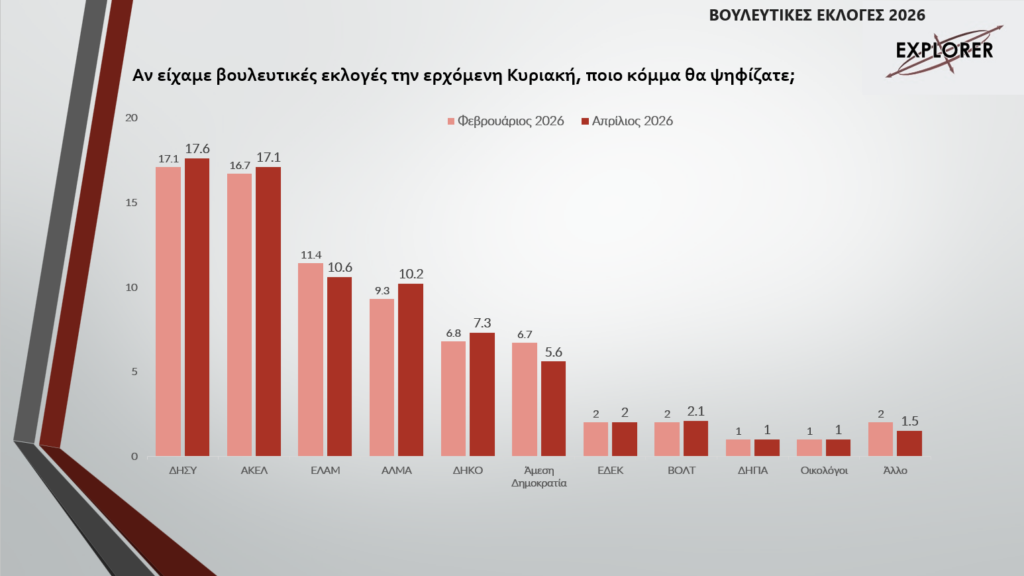 Αναλυτικά, σύμφωνα με τα αποτελέσματα της έρευνας, ο ΔΗΣΥ εξακολουθεί να βρίσκεται στην πρώτη θέση με ποσοστό 17,6%, καταγράφοντας μικρή αύξηση 0,5% σε σχέση με την προηγούμενη δημοσκόπηση. Στη δεύτερη θέση, με οριακή διαφορά, ακολουθεί το ΑΚΕΛ με ποσοστό 17,1%, το οποίο επίσης καταγράφει αύξηση 0,4% σε σχέση με τον Φεβρουάριο. Η διαφορά μεταξύ των δύο κομμάτων παραμένει σχεδόν η ίδια, ωστόσο, διευρύνουν το προβάδισμά τους έναντι του τρίτου κόμματος, που είναι το ΕΛΑΜ, το οποίο καταγράφει ποσοστό 10,6% έναντι 11,4% στην προηγούμενη δημοσκόπηση.