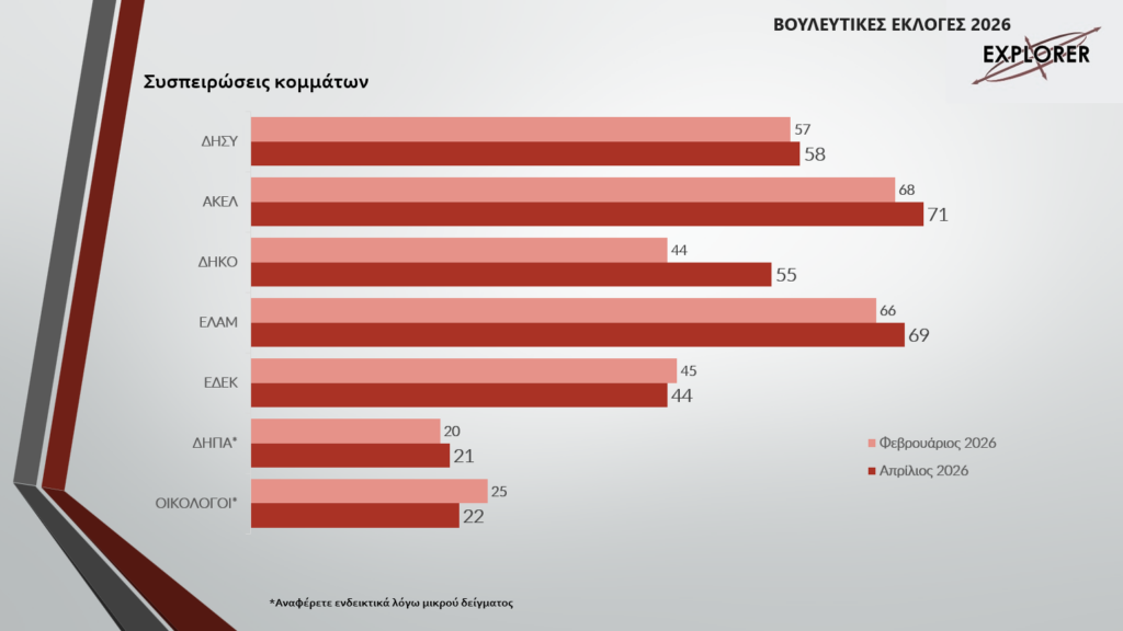 Συνεπώς, με βάση τα ευρήματα της δημοσκόπησης της EXPLORER, στη νέα Βουλή ενδέχεται να εκπροσωπηθούν έξι ή και περισσότερα κόμματα, χωρίς ξεκάθαρες πλειοψηφίες. Τα δύο μεγάλα κόμματα εμφανίζονται αποδυναμωμένα σε ποσοστά και έδρες, ενώ ΕΛΑΜ και ΑΛΜΑ επιχειρούν να ενισχύσουν τη θέση τους στο νέο πολιτικό σκηνικό. Το ΔΗΚΟ δίνει μάχη για να διατηρήσει μέρος του ρυθμιστικού του ρόλου, ενώ η Άμεση Δημοκρατία παραμένει απρόβλεπτη παράμετρος.