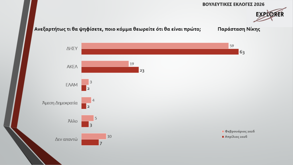 Σε σχέση με την παράσταση νίκης και το ερώτημα ποιο κόμμα θεωρούν οι πολίτες ότι θα κερδίσει τις εκλογές, ανεξαρτήτως της δικής τους ψήφου, ο ΔΗΣΥ προηγείται με 63% έναντι 23% του ΑΚΕΛ. Και τα δύο κόμματα αυξάνουν τα ποσοστά τους, με τη μεταξύ τους διαφορά να παραμένει σταθερή με την ψαλίδα υπέρ του Συναγερμού.