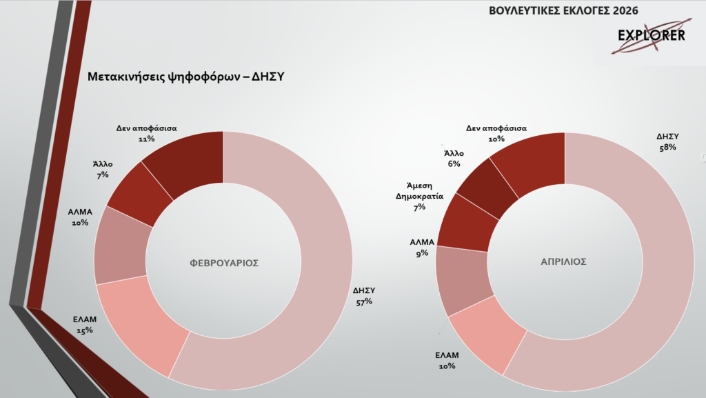 Ιδιαίτερο ενδιαφέρον παρουσιάζουν και οι μετακινήσεις ψηφοφόρων. Για τον ΔΗΣΥ, η μεγαλύτερη διαρροή παραμένει προς το ΕΛΑΜ (10%), αν και εμφανίζεται μειωμένη. Ακολουθεί προς το ΑΛΜΑ (9%), ενώ καταγράφονται και διαρροές προς την Άμεση Δημοκρατία. Ποσοστό 10% δηλώνει αναποφάσιστο.