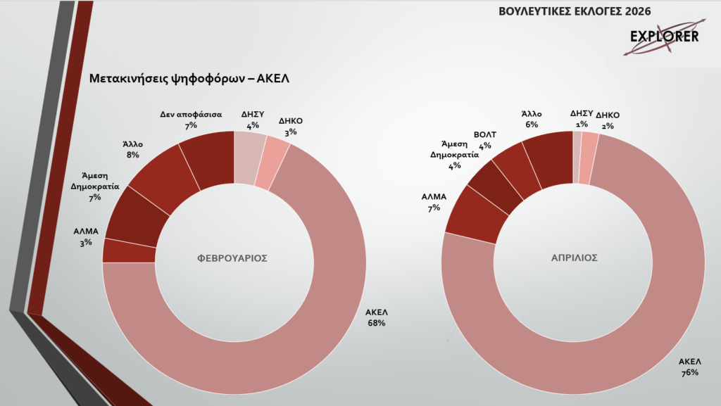 Στο ΑΚΕΛ, οι διαρροές προς το ΑΛΜΑ αυξάνονται από 3% σε 7%, ενώ καταγράφονται επίσης διαρροές 4% προς ΒΟΛΤ και 4% προς Άμεση Δημοκρατία.