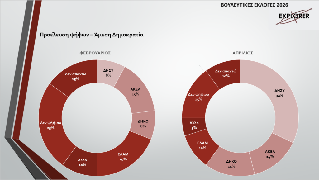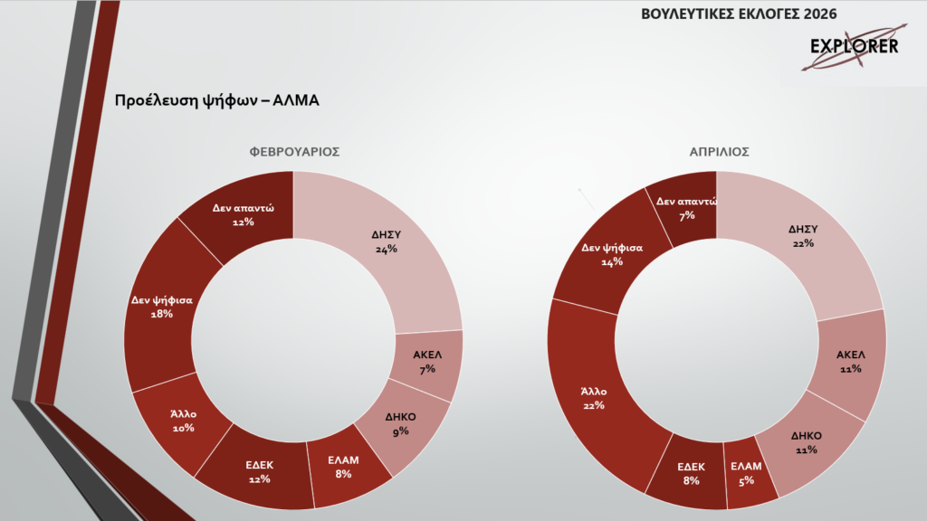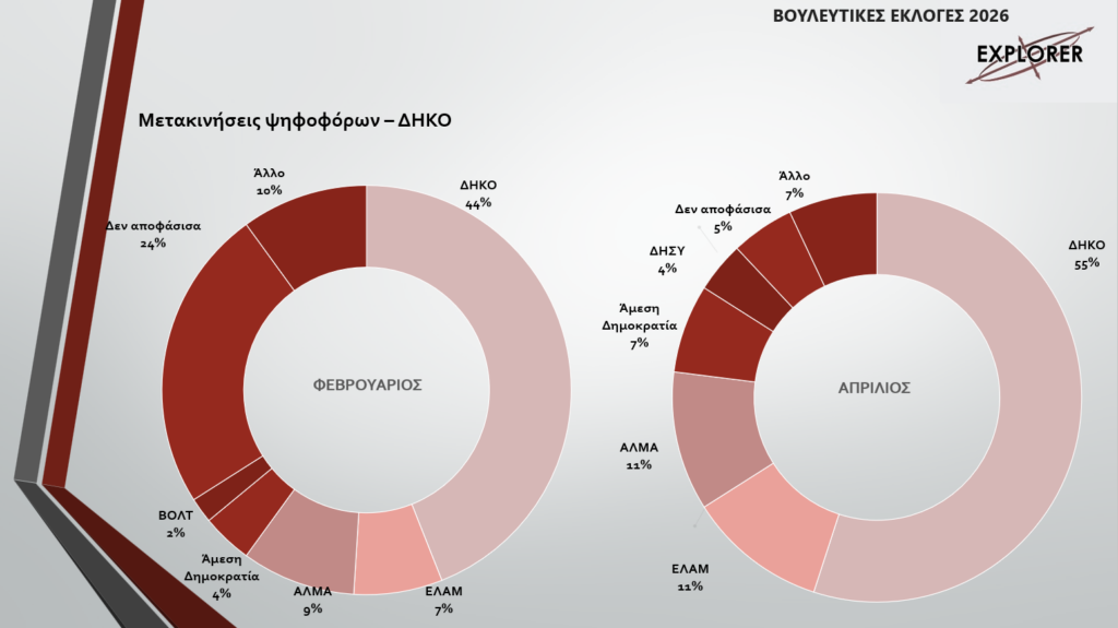 Το ΔΗΚΟ παρουσιάζει σημαντικές διαρροές προς ΑΛΜΑ (11%) και ΕΛΑΜ (11%), αυξημένες σε σχέση με τον Φεβρουάριο, ενώ μειώνεται το ποσοστό των αναποφάσιστων στο 5%.