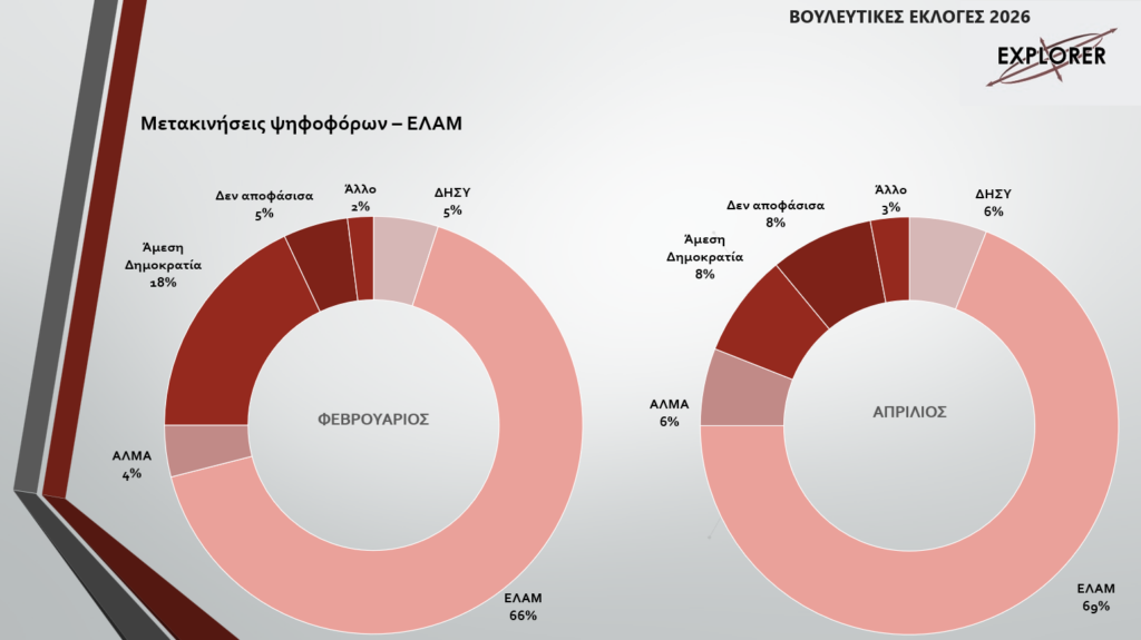 Το ΕΛΑΜ καταγράφει τη μεγαλύτερη διαρροή προς την Άμεση Δημοκρατία (8%), μειωμένη ωστόσο από το 18% του Φεβρουαρίου. Παράλληλα, αυξάνονται ελαφρώς οι διαρροές προς ΑΛΜΑ και ΔΗΣΥ (από 4% σε 6% και από 5% σε 6% αντίστοιχα).
