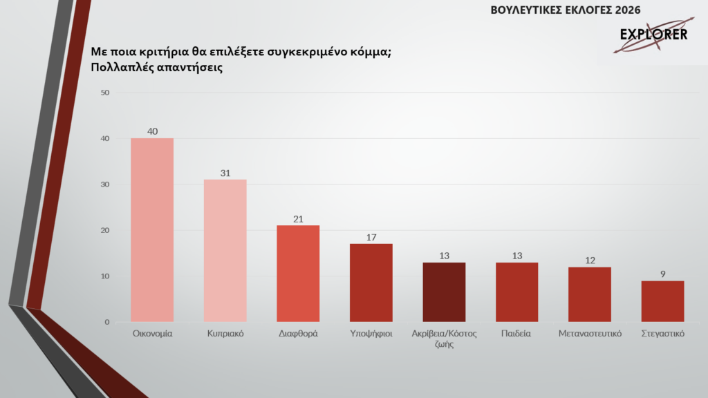 Η οικονομία, το κυπριακό και η πάταξη της διαφθοράς αποτελούν τα βασικά κριτήρια ψήφου. Συγκεκριμένα, το 40% αναφέρει την οικονομία, 31% το Κυπριακό και 21% τη διαφθορά.