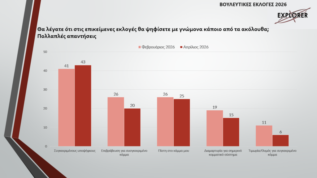 Στο ερώτημα για τα κίνητρα ψήφου, το 43% δηλώνει ότι θα ψηφίσει με βάση συγκεκριμένους υποψηφίους, 25% λόγω κομματικής ταύτισης, 20% για επιβράβευση κόμματος, 15% ως ψήφο διαμαρτυρίας και 6% για τιμωρία κόμματος.