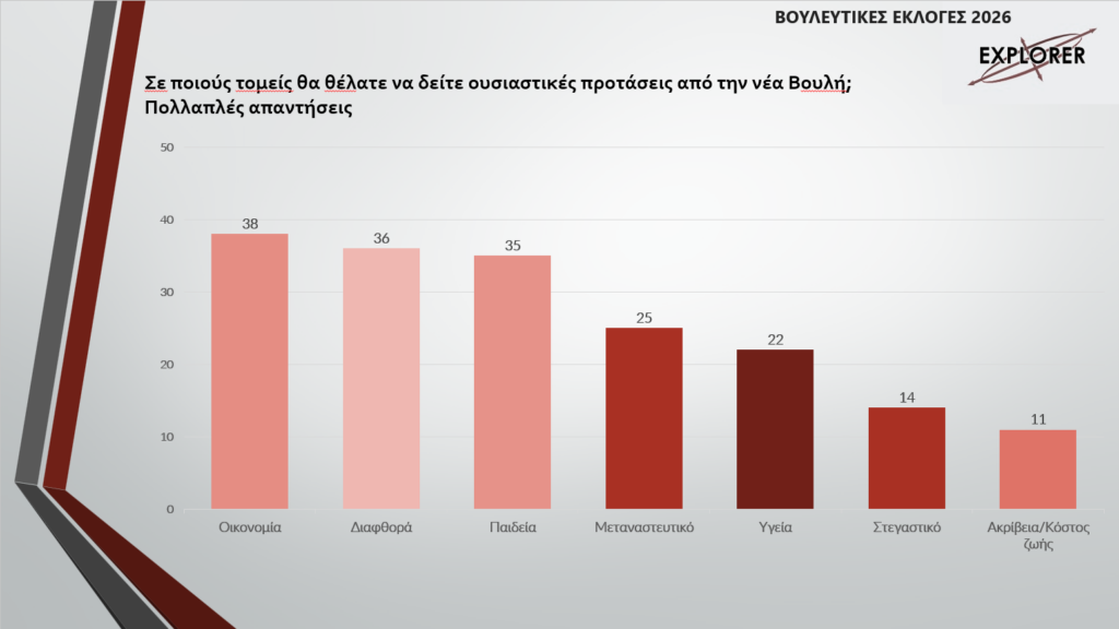 Ως προς τους τομείς στους οποίους οι πολίτες επιθυμούν ουσιαστικές προτάσεις από τη νέα Βουλή, πρώτη έρχεται η οικονομία (38%), ακολουθεί η διαφθορά (36%), η παιδεία (35%), το μεταναστευτικό (25%), η υγεία (22%) και το στεγαστικό (14%).