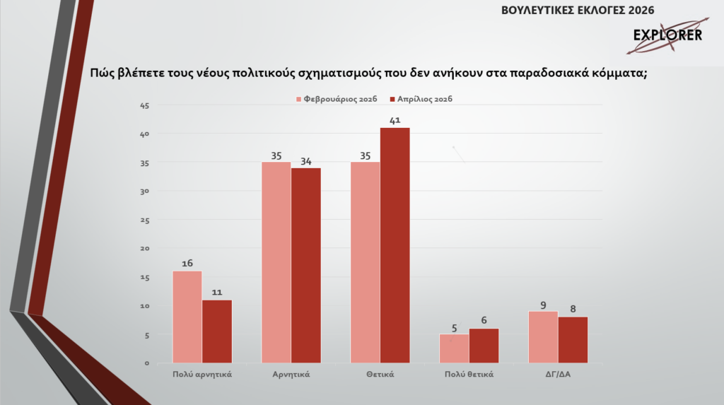 Σε ό,τι αφορά τους νέους πολιτικούς μηχανισμούς και το πώς τους βλέπουν οι πολίτες, το 41% απάντησε θετικά και το 6% πολύ θετικά, έναντι 34% αρνητικά και 11% πολύ αρνητικά. Τα αντίστοιχα ποσοστά τον Φεβρουάριο ήταν 35% θετικά και 5% πολύ θετικά και 35% αρνητικά με 16% πολύ αρνητικά.