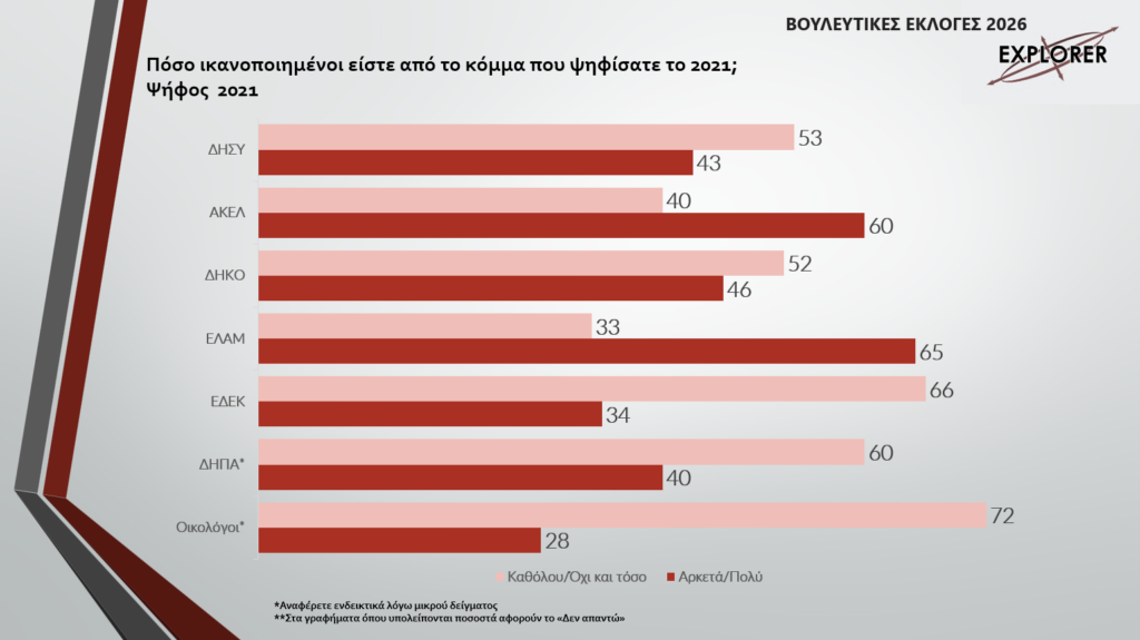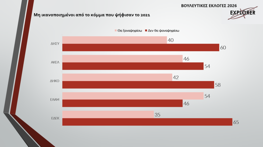 Η πλειοψηφία εκείνων που εμφανίζονται να μην είναι ικανοποιημένοι από το κόμμα που ψήφισαν στις βουλευτικές του 2021 δηλώνουν πως δεν θα το ξαναψηφίσουν. Ιδιαίτερα έντονο είναι αυτό το συναίσθημα προς παραδοσιακά κόμματα ΔΗΣΥ, ΑΚΕΛ, ΔΗΚΟ και ΕΔΕΚ.