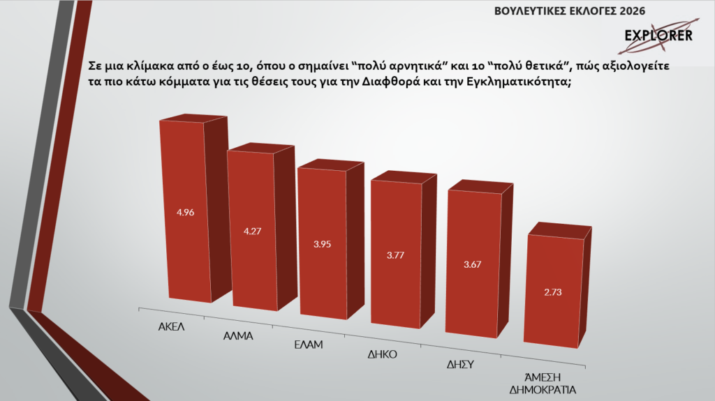 Διαφθορά και εγκληματικότητα: ΔΗΣΥ 3,67, ΑΚΕΛ 4,96, ΕΛΑΜ 3,95, ΔΗΚΟ 3,77, ΑΛΜΑ 4,27, ΑΜ.ΔΗ. 2,73.