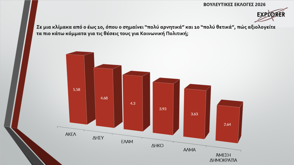 Κοινωνική πολιτική: ΔΗΣΥ 4,68, ΑΚΕΛ 5,58, ΕΛΑΜ 4,3, ΔΗΚΟ 3,93, ΑΛΜΑ 3,63, ΑΜ.ΔΗ. 2,64.