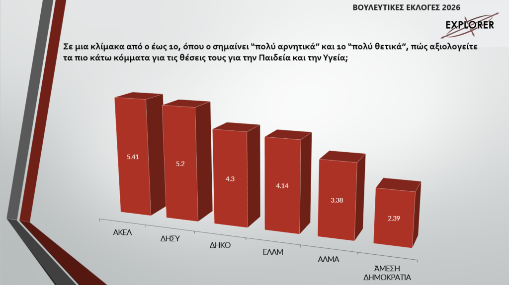 Παιδεία και Υγεία: ΔΗΣΥ 5,2, ΑΚΕΛ 5,41, ΕΛΑΜ 4,14, ΔΗΚΟ 4,3, ΑΛΜΑ 3,38, ΑΜ.ΔΗ 2,39.