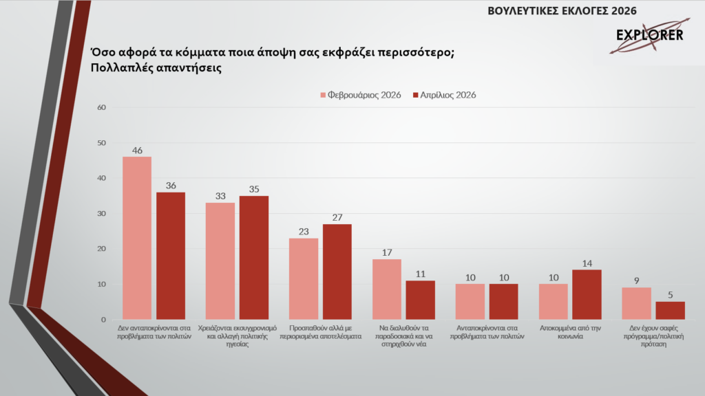 Θα πρέπει πάντως να σημειωθεί ότι σε σύγκριση με την έρευνα του Φεβράρη, τον Απρίλη έχει μειωθεί κατά πολύ ο αριθμός εκείνων που θεωρούν ότι τα κόμματα δεν ανταποκρίνονται στα προβλήματα των πολιτικών και από το 46% έπεσε στο 36%. Ταυτόχρονα καταγράφεται μικρή άνοδος ανάμεσα σ’ εκείνους που θεωρούν ότι τα κόμματα καταβάλλουν προσπάθεια αλλά με περιορισμένα αποτελέσματα. Ένας στους τρεις παραμένει σταθερός στη θέση πως τα κόμματα χρειάζονται εκσυγχρονισμό και αλλαγή πολιτικής ηγεσίας.