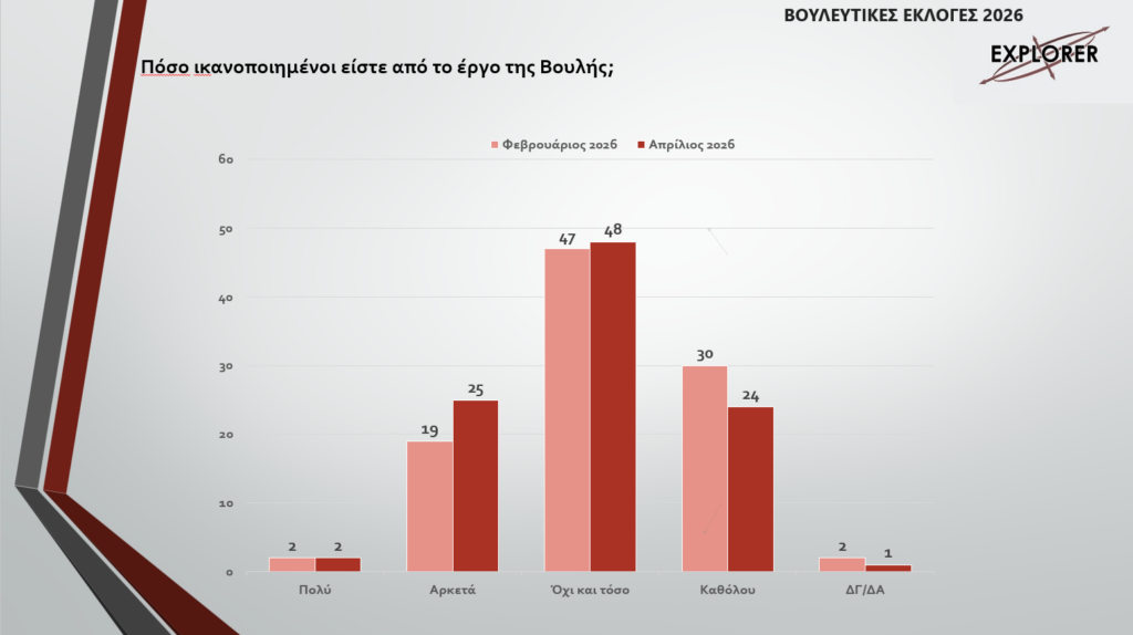 Η πλειοψηφία των ερωτηθέντων εμφανίζεται να μην ικανοποιημένη από το έργο της Βουλής, αν και μεταξύ Φεβρουαρίου και Απριλίου υπήρξε μια αύξηση σ’ όσους δηλώνουν μετά βεβαιότητας αρκετά ικανοποιημένοι από κοινοβουλευτικό έργο και από το 19% του Φεβράρη πήγε στο 25% τον Απρίλη. Ένας στους δύο δηλώνει πως δεν είναι και τόσο ικανοποιημένος από το έργο της Βουλής, τον Φεβρουάριο ήταν στο 47 και τώρα πήγε στο 48 %. Ταυτόχρονα υπήρξε μια μείωση σ’ αυτούς που δεν έμειναν καθόλου ικανοποιημένοι, από το 30 πήγε στο 24 %.