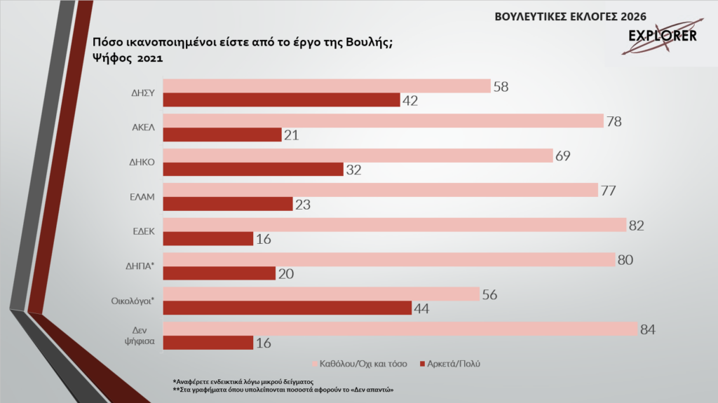 Σε όλα τα κόμματα αλλά και μεταξύ εκείνων που δεν ψήφισαν το 2021 η πλειοψηφία δηλώνει πως δεν έμεινε ικανοποιημένη από το έργο της Βουλής. Ως προς το βαθμό που είναι ικανοποιημένοι από το κόμμα ή τους βουλευτές που ψήφισαν, η πλειοψηφία δύο στους τρεις κινείται μεταξύ του αρκετά και όχι και τόσοι ικανοποιημένοι. Ένας στους πέντε δηλώνει καθόλου ικανοποιημένος τον Απρίλη ενώ τον Φεβράρη ήταν ένας στους πέντε. Και μόλις ένας στους δέκα εμφανίζεται πολύ ικανοποιημένος από κόμματα και βουλευτές.