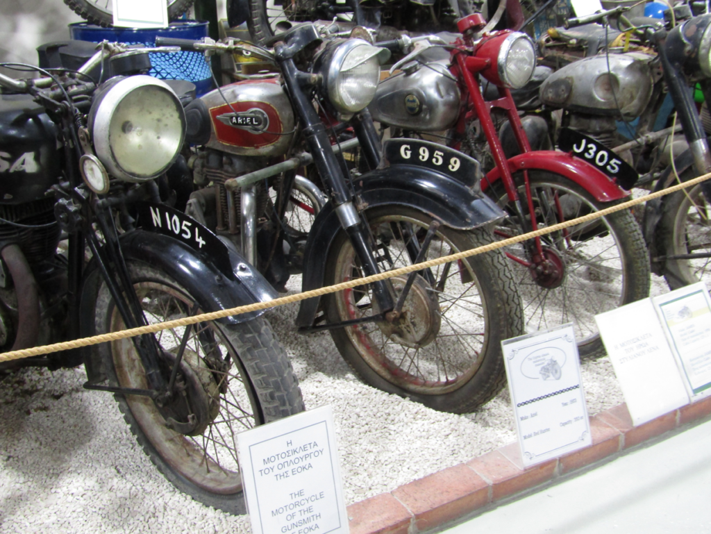 Η μοτοσικλέτα, την οποίαν οδηγούσε ο Στυλιανός Λένας, ο βαθιά θρησκευόμενος «Κρουπ» της ΕΟΚΑ, που ξεψύχησε στις 28 Μαρτίου 1957, μετά από τραυματισμό σε ενέδρα, αγοράστηκε από ιδιώτη, στη Λακατάμια. Πρόκειται για μία κόκκινη James Cadet του 1954 (αρ. J305). Η σύνδεση με τον Λένα αποκαλύφθηκε στον Ανδρέα από τον «έγκλειστο ποιητή» Στυλιανό Κοιρανίδη (D.P. 87), συναγωνιστή του ήρωα. Δίπλα της, μία Ariel Red Hunter του 1953, η οποία ανήκε στον Ανδρέα Αζίνα, στενό συνεργάτη του Αρχιεπισκόπου Μακαρίου Γ΄ και του Γεωργίου Γριβα Διγενή. Παραδίπλα, η BSA του 1939, μοτοσικλέτα του Χριστόδουλου Αλλαγιώτη, οπλουργού της ΕΟΚΑ, μέλους ομάδας κρούσεως στην Κυπερούντα και την Πιτσιλιά, με πατέντα για τη μεταφορά των όπλων (αρ. Ν1054).