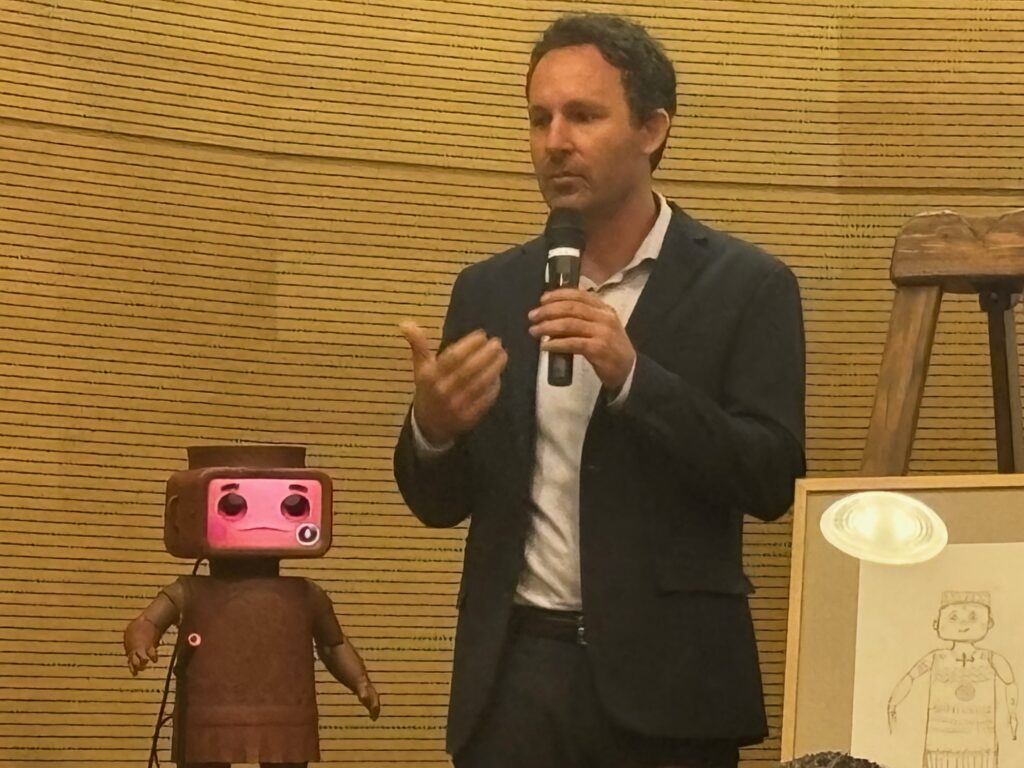 Το κεφάλι του διαθέτει οθόνη που προβάλλει ανθρώπινες εκφράσεις – χαμόγελο, περιέργεια ή απορία – επιτρέποντας μια φυσική και άμεση αλληλεπίδραση με τον επισκέπτη και προσφέροντας μια προσωπική εμπειρία μάθησης και επικοινωνίας.