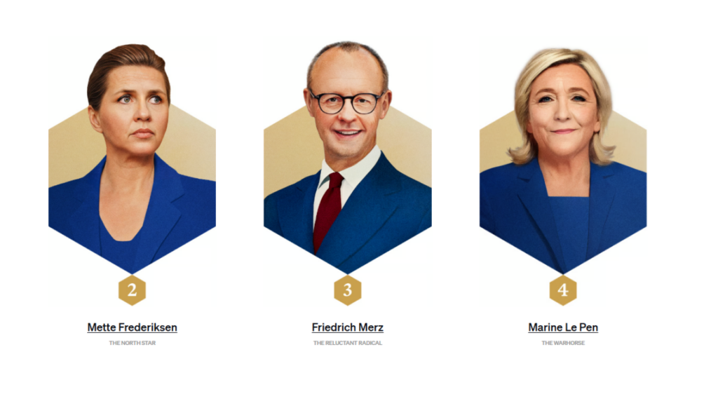 Στην κύρια κατάταξη των 28 προσώπων, την κορυφή καταλαμβάνει ο Ντόναλντ Τραμπ, με τη Δανή πρωθυπουργό Μέττε Φρέντρικσεν και τον Γερμανό καγκελάριο Φρίντριχ Μερτς να συμπληρώνουν την πρώτη τριάδα. Στην πρώτη 5άδα βρίσκονται επίσης η Μαρίν Λεπέν και ο Βλαντίμιρ Πούτιν.